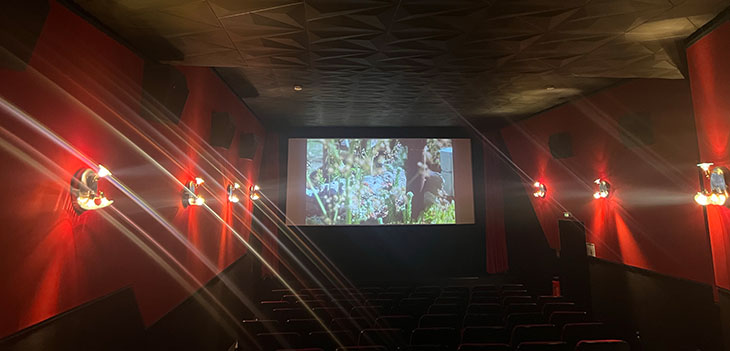 | Links: Kinosaal mit geladenen Gästen Mitte: Kunstreferentin Angelika Summa mit Vorstellung der teilnehmenden Künstler und deren Projekten Rechts: Ansprache Landrätin Tamara Bischof |