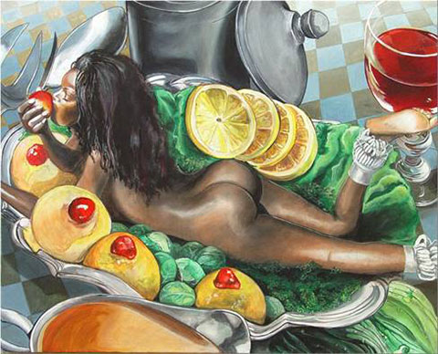 | Das daraus resultierende Bodypainting - siehe oben. Werbemaßnahme für Servus TV - nach obiger Gemäldevorlage. Original verkauft/Sammlung, Drucke in jeder gewünschten Größe möglich. |