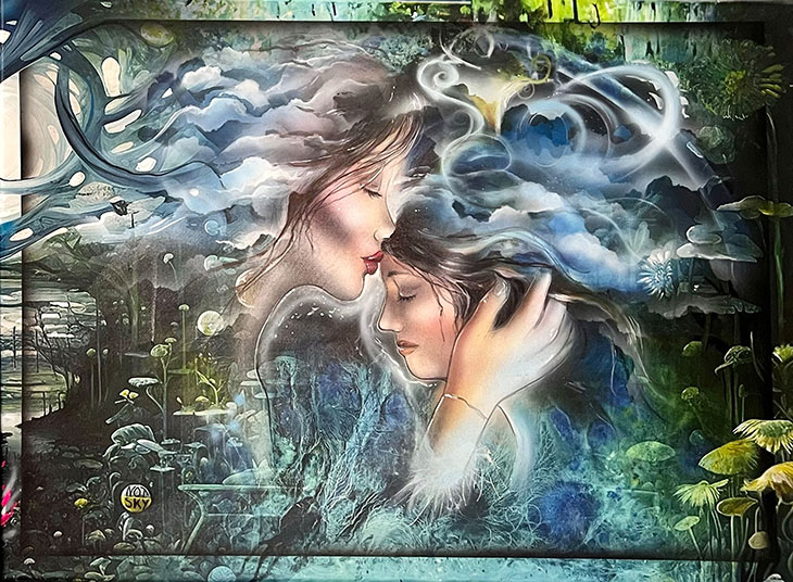 | Unser zweites gemeinsames Kunstwerk, "Der Kuss der wahren Liebe", wurde inspiriert durch ein Gedicht von dem österreichischen Schriftsteller Gottlieb Saphir. Die Idee dazu gelangte zur Künstlerin Christine Dumbsky. Daraus entstanden mehrere Versionen, und die Idee entwickelte sich, dies gemeinsam mit ihrem Künstlerkollegen Norbert Heiek bildlich umzusetzen. |